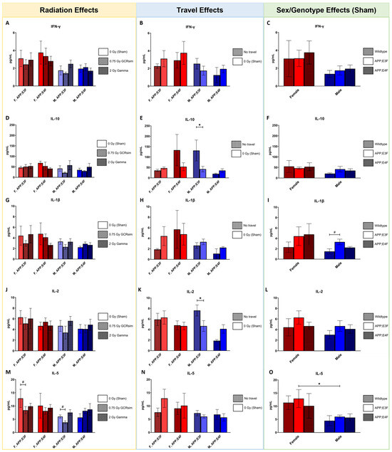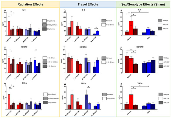 Irradiation with 0.75 Gy GCRsim had a modest effect on plasma IL-5 levels, with irradiated APP;E3F mice of both sexes showing a trend towards lower levels (Figure 5M, p = 0.0814 and p = 0.0534 in female and male, respectively). Next, radiation effects were observed for IL-6 in female APP;E3F mice (Figure 5P), with plasma levels being significantly lower in 0.75 Gy GCRsim-irradiated individuals (p = 0.0464) and showing a trend towards lower levels in 2 Gy gamma-irradiated mice (p = 0.986) compared to sham controls, respectively. For KC/GRO, plasma levels were significantly lower in 0.75 Gy GCRsim-irradiated animals compared to sham controls (Figure 5S, p = 0.0401 and p = 0.0495 in females and males, respectively). Furthermore, plasma levels of TNF-α were significantly decreased by 0.75 Gy GCRsim and 2 Gy gamma radiation in female APP;E3F mice compared to sham controls (Figure 5V, p = 0.0073 and p = 0.038). In contrast, plasma levels of IFN-γ, IL-10, IL-1β, and IL-2 were not affected by irradiation with 2 Gy gamma or 0.75 Gy GCRsim (Figure 5A,D,G,J).