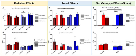 Effects of radiation, travel, sex, and genotype on ApoE and Aβx-42 levels in brain homogenates of GCRsim- and gamma-irradiated APP;E3F and APP;E4F mice 7 months post-irradiation. (A–C) ApoE concentration in the brain was quantified using an in-house sandwich ELISA. (D–F) Levels of Aβx-42 in the brain were quantified using an ELISA. #: p < 0.1, *: p < 0.05, ***: p < 0.001, ****: p < 0.0001. Data (A,B,D,E) were analyzed using a three-way ANOVA. Data (C,F) were analyzed using a two-way ANOVA for comparisons between sex and multiple t-tests within genotypes. Data with highly different variances were compared with either one-way ANOVA or multiple t-test. p values were not adjusted for multiple comparisons.