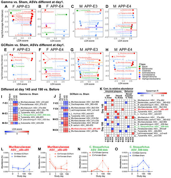 LEfSe analysis of differentially abundant bacterial taxa revealed that both gamma- and GCRsim-irradiated mice had differentially abundant bacteria in their stool compared to sham-treated mice at the amplicon sequence variant (ASV) level (Figure 7A–H) one day after irradiation. Differences were observed in both female and male mice and in mice with different genotypes with regard to ApoE. Among differentially abundant bacteria, we observed several bacterial species belonging to classes Bacterodia and Clostridia. For instance, female APP;E3F mice treated with gamma radiation had a higher abundance of several Bacterodia ASV belonging to the Prevotellaceae family and Parabacteroides genus (Figure 7A). Female mice APP;E3F treated with gamma radiation, on the other hand, had lower levels of an ASV belonging to the Bacteroidia genus Muribaculum and a higher abundance of an ASV assigned to the Dubosiella genus. We also observed ASVs that were different as long as 145 and 190 days after irradiation when comparing irradiated mice to sham mice (Figure 7I,J). To understand if these differences in bacterial composition could be linked to phenotypic differences observed in irradiated mice, long-term differentially abundant ASVs were correlated to measurements of brain amyloid plaque levels and behavioral outcomes from the forced-alternation Y-maze (Figure 7K). An interesting observation was that an ASV from the genus Muribaculaceae that was more abundant in GCRsim-irradiated male APP;E4F mice (compared to sham) had a positive correlation to ThioS-stained amyloid plaques in the same group (Spearman’s R = 0.48, p = 0.034) and that an ASV belonging to C. stonquefichus that was less abundant in gamma-irradiated male APP;E3F mice correlated negatively with the Y-maze test for spatial memory (Spearman’s R = −0.57, p = 0.0038). Figure 7L–O illustrate how these bacteria changed in abundance over time in male and female mice.