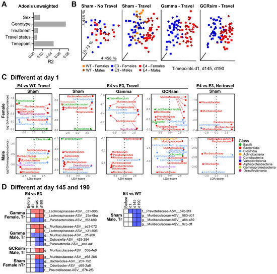 Genotype influenced the gut microbial composition in control and irradiated mice. Male (M) and female (F) APP-ApoE3 knock-in (E3) and APP-ApoE4 knock-in (E4) mice travelled (Tr) to the Brookhaven National Laboratory facility at 14 months of age and were exposed to either 0.75 GCRsim, 2 Gy gamma, or 0 Gy (Sham) radiation. Fecal pellets from the mice were collected before (0 days), the day after, 145 days after, and 190 days after irradiation and analyzed with 16S rRNA sequencing. Bacterial taxa that were detected in at least two-thirds of the samples were included in the analysis. Differences in the relative abundance of bacteria were analyzed with linear discriminant analysis (LDA) effect size (LEfSe) at the amplicon sequence variant (ASV) level. Unweighted permutational analysis of variance (Adonis test) of sex, genotype, treatment, travel status, and timepoint of the microbiome samples (A). Unweighted UniFrac distance colored by genotype and split by type of radiation (B). Differently abundant ASVs one day after irradiation compared to sham controls. The graph shows each bacterial taxa that were significantly different as their LDA score (higher than 0 is more abundant, lower is less abundant) plotted against the logarithm of their average relative abundance (C). Heatmaps of bacteria that were significantly different from baseline at both 145 days and 190 days post-irradiation. All colored boxes had a p < 0.05 (D).