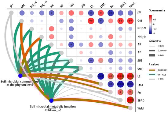 2.4. Interaction among Soil Microbial Communities, Soil Chemical Properties, and Agronomic Parameters