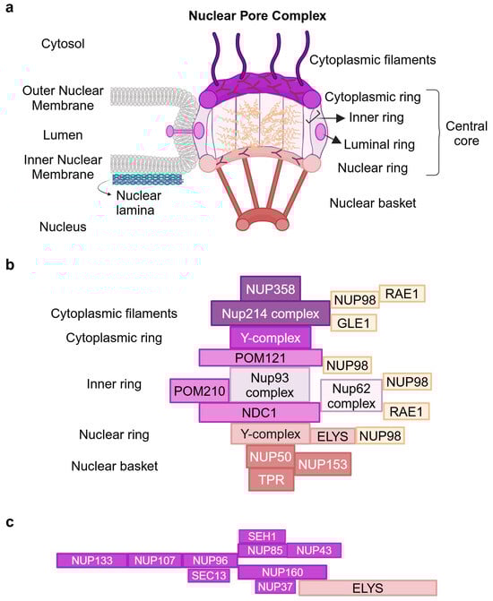 Overview of the Nuclear Pore Complex Architecture. (a) NPC central core: Cytoplasmic Ring (CR), Nuclear Ring (NR), Luminal Ring (LR), Inner Ring (IR), and the peripheral Cytoplasmic Filaments (CF) and Nuclear Basket (NB) structures protruding towards the cytosol and the nucleus. IR encircles the NPC central channel filled with the FG-Nups comprising the diffusion barrier. The rings and the peripheral structures are depicted in different colors from purple to light pink. FG repeats protruding into the channel are indicated in light orange. Adapted from “Components of the Nuclear Pore Complex”, by BioRender.com (2024). Retrieved from https://app.biorender.com/biorender-templates (30 July 2024) []. (b) Schematic of the NUP complexes of NPC central core and peripheral structures. (c) Schematic of the Y-shaped Coat Nucleoporin Complex (CNC) with the stem components NUP133, NUP107, NUP96, and SEC13; the short arm components SEH1, NUP85, NUP43, and the long arm components NUP37, NUP160 plus the asymmetric ELYS on the nuclear face. Figure created with BioRender.com (30 July 2024) [].