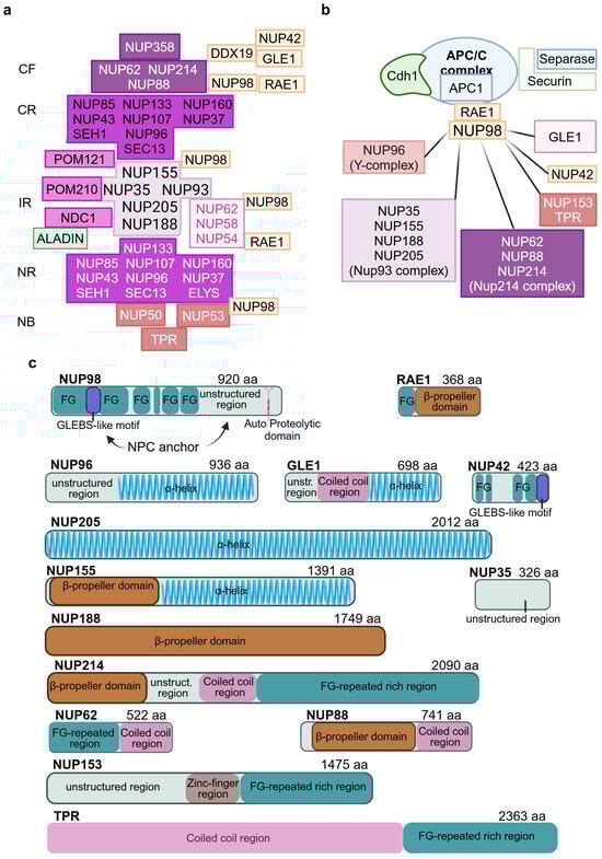 The NUP98 architecture comprises three regions. The N-ter region with the FG domain of the first and longest IDR and the GLEBS-like motif which binds the RNA export factor RAE1 (Figure 2a,c) acting in different phases of RNA export []. NUP98-RAE1 regulates APC/C associated with Cdh1 (Figure 2b), which in early mitosis safeguards euploidy [] and in G2 cells controls the response to DNA damage []. The NUP98 middle unstructured region is characterized by motifs mediating the interactions with the inner ring Nups NUP35, NUP155, NUP188, and NUP205 of the NUP93 complex (Figure 2b,c). It has been proposed that NUP98, NUP35, and the linker region of NUP93 connect the scaffold of the four layers [,]. The C-ter APD (Auto Proteolytic Domain) is required to obtain the self-cleavage of NUP98 from NUP96, a component of the Y-complex of the outer rings (Figure 2a–c) []. To recapitulate, NUP98‘s full-length transcript is translated into a single NUP98-NUP96 precursor protein, with NUP98 and NUP96 representing the N-ter and C-ter portions, respectively []. NUP96 can still bind the APD after cleavage []. The C-ter APD is also involved in the interaction of CF NUP88 (a member of the Nup214 complex as well as NUP62) with the NUP98-RAE1 complex (Figure 2a–c). The imbalance of NUP88-NUP98-RAE1 proteins, due to NUP88 overexpression or NUP98-RAE1 haploinsufficiency, activates APC/C leading to the degradation of PLK1 kinase by NUP88 and the disruption of normal centrosome separation and aneuploidy []. Finally, hyper-phosphorylation of the NUP98 C-ter domain by several mitotic kinases is the decisive event for NPC disassembly and entry in mitosis [].