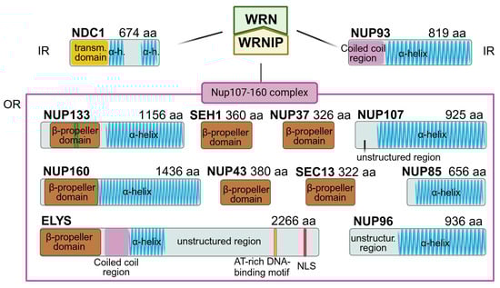Framework of interactions between WRN/WRNIP complex and NPC. The WRN/WRNIP complex interacts with the Nup107–160 complex and nucleoporins NUP93 and NDC1 of the inner ring (IR). The schematic architecture of nucleoporins major known domains is shown: α-helical in blue, β-propeller in brown, coiled coil domains in pink, transmembrane domain in yellow, nuclear localization signal (NLS) in red, and AT-rich DNA-binding motif in orange. Numbers after the nucleoporin name indicate the amino acid residues. IR: inner ring, OR: outer rings. Figure created with BioRender.com (30 July 2024) [].