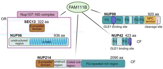 The interconnecting network between FAM111B and NPC. FAM111B interacts with SEC13 and NUP96 nucleoporins belonging to the Nup107–160 complex of the outer rings, the CF NUP214, NUP98, and NUP42, with the latter also located in the central channel. The schematic architecture of the major known domains of the nucleoporins is shown with FG-domains in teal, α-helical in blue, β-propeller in brown, coiled coil domains in pink, the GLEBS-like motif in indigo, and the NPC anchor in orange. Numbers after the nucleoporin name indicate the amino acid residues. OR: outer rings, CF: cytoplasmic filaments. Figure created with BioRender.com (30 July 2024) [].