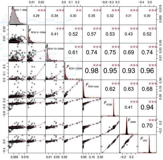 - Keller, M.C.; Visscher, P.M.; Goddard, M.E. Quantification of inbreeding due to distant ancestors and its detection using dense single nucleotide polymorphism data. Genetics 2011, 189, 237–249. [Google Scholar] [CrossRef] [PubMed]