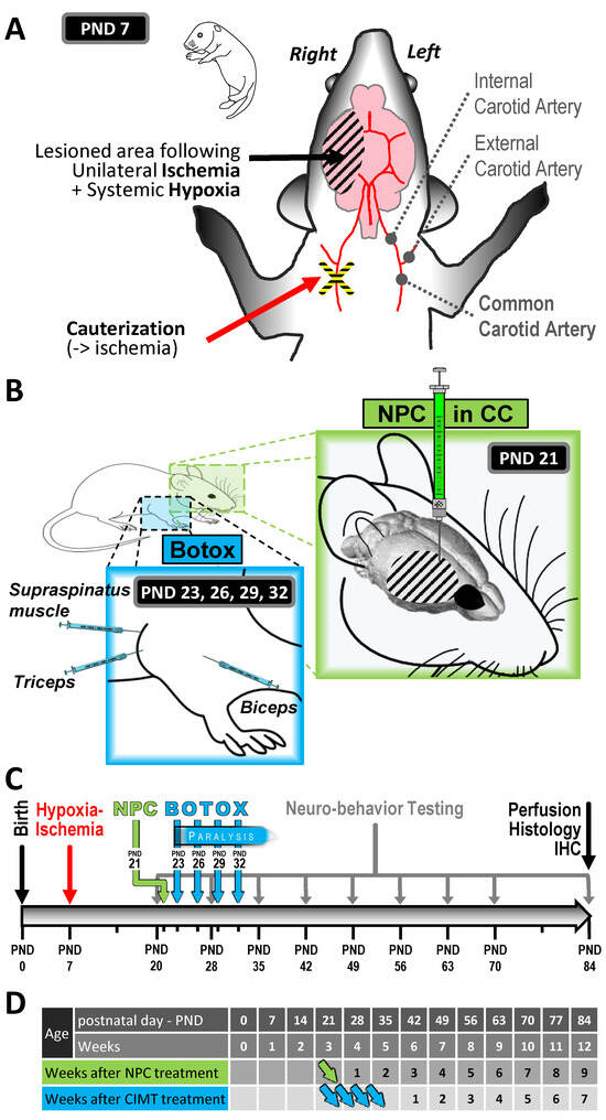 Rumajogee, P.; Altamentova, S.; Li, J.; Puvanenthirarajah, N.; Wang, J.; Asgarihafshejani, A.; Van Der Kooy, D.; Fehlings, M.G. Constraint-Induced Movement Therapy (CIMT) and Neural Precursor Cell (NPC) Transplantation Synergistically Promote Anatomical and Functional Recovery in a Hypoxic-Ischemic Mouse Model. Int. J. Mol. Sci. 2024, 25, 9403. https://doi.org/10.3390/ijms25179403