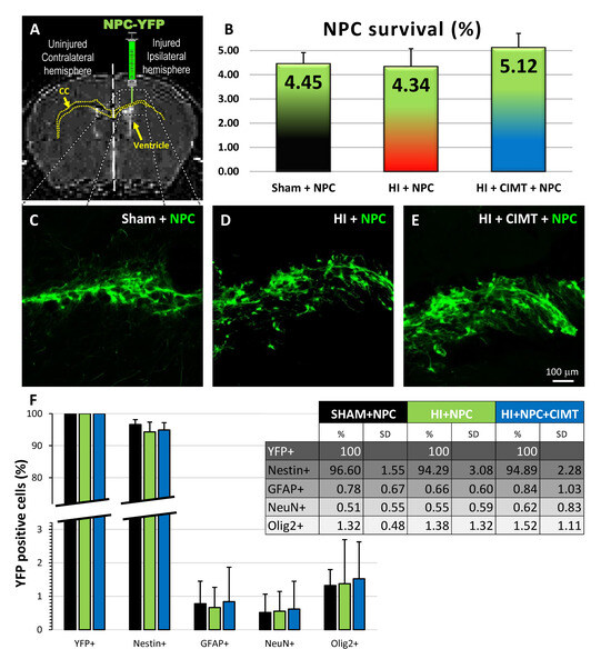 2.1. Transplanted NPCs Survive, Migrate, Differentiate Morphologically, and Integrate in the Corpus Callosum