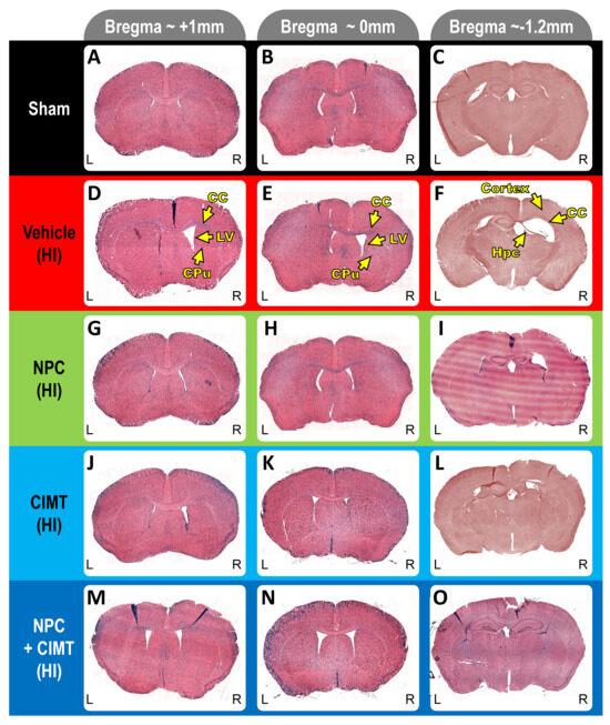 2.2.4. HI Injury Significantly Affects the Corpus Callosum, and Treatment with NPCs and CIMT Leads to Recovery