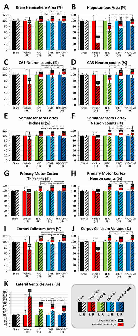 2.2.5. HI Injury Notably Affects the Lateral Ventricle, and Treatment with NPCs and CIMT Leads to Significant Recovery