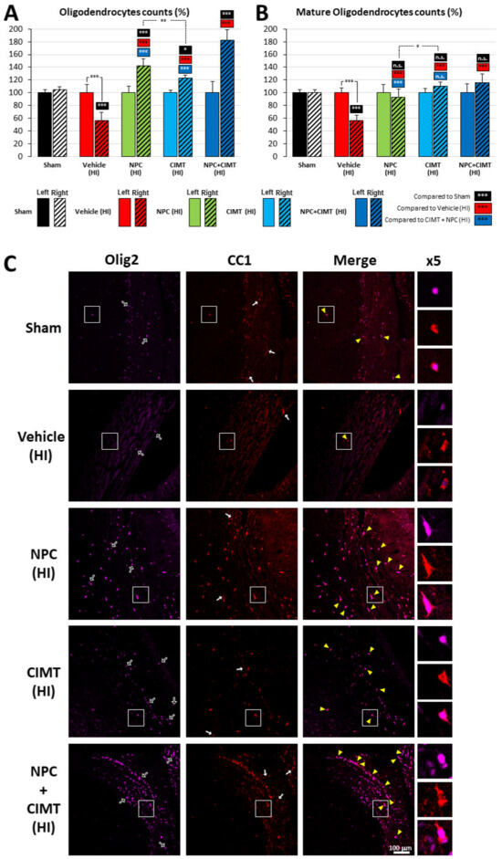 2.3.1. Following HI, Treatment with NPCs and CIMT Restored the Endogenous OL Population above the Normal Level, While the Mature OL Population Was Normalized