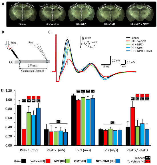 2.3.2. HI Injury Significantly Affects Myelination of the CC and Treatment with NPCs and CIMT Leads to Functional Myelination