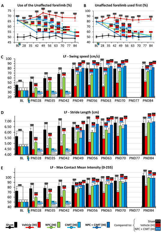 2.4. Transplanted NPC, CIMT, and NPC + CIMT Treatments Led to Functional Recovery