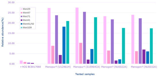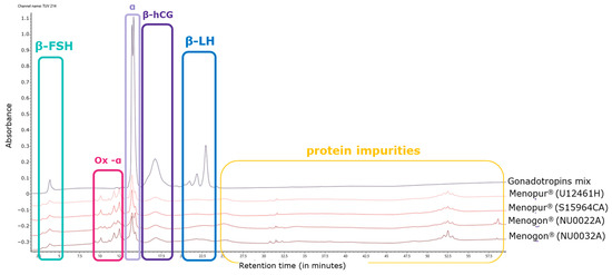 - Bassett, R.; Ceccarelli, D.; Crisci, C.; di Tria, A.M.; Mancinelli, M.; Martelli, F.; Mendola, D.; Pezzotti, A. Comparative analytical characterization of two commercial human follicle-stimulating hormones extracted from human urine. Curr. Med. Res. Opin. 2005, 21, 899–905. [Google Scholar] [CrossRef] [PubMed]
