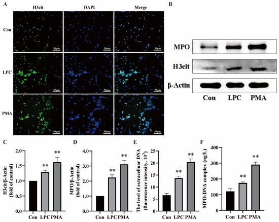 In order to validate the establishment of the in vitro model, our study employed a range of methods to confirm NETs formation. NETs are composed of DNA, H3cit, and MPO. The extracellular release and increased expression of H3cit and MPO indicate NETs formation [36]. Neutrophils were treated with RPMI1640, LPC (100 μg/mL), or PMA (200 nmol/L) for 3 h, respectively. Under a fluorescence microscope, we observed obvious H3cit-attached reticulation in the 100 μg/mL LPC group and the PMA group, but not in the control group (Figure 2A). Western blot analysis was utilized to identify the characteristic proteins of NETs, including H3cit and MPO. The results showed that both 100 μg/mL LPC and PMA treatment increased the expression of H3cit and MPO compared to the control group (Figure 2B–D). Furthermore, NETs were quantified by using SYTOX green staining for cf-DNA, a crucial constituent of NETs. The fluorescence intensity in the 100 μg/mL LPC and PMA groups was higher than in the control group (p < 0.01) (Figure 2E). Next, we also conducted an ELISA for MPO-DNA complexes. MPO-DNA is also a characteristic component of NETs. The results showed that the treatment of cells with 100 μg/mL LPC and PMA increased the MPO-DNA level in the supernatant (Figure 2F). These results suggested that 100 µg/mL LPC was the proper concentration to induce NETs in vitro.