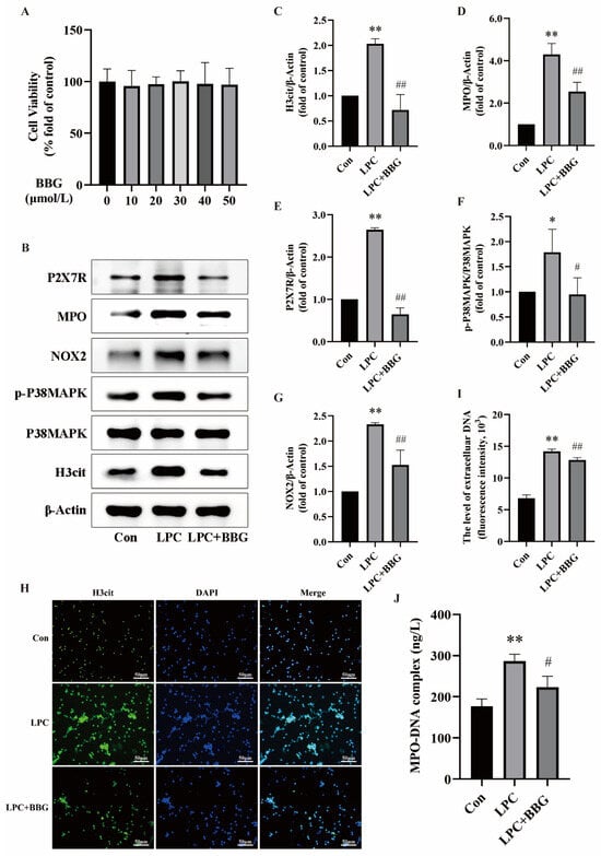 LPC-induced NETs formation depends on up-regulation of P2X7R expression. (A) The effect of BBG on the cell viability of neutrophils (mean ± SD, n = 5). (B) Cells were treated by RPMI1640, LPC (100 μg/mL), or LPC + BBG (20 μmol/L) for 3 h. Representative immunoblots probed for H3cit, P38MAPK, p-P38MAPK, NOX2, MPO, P2X7R, and β-Actin are shown. (C–G) The ratio of p-P38MAPK/P38MAPK and quantitative densitometric analyses of H3cit, MPO, P2X7R, and NOX2 normalized to β-Actin. (H) The formation of NETs was identified by labeling with H3cit and observed by fluorescence microscopy (scale bar, 50 µm). (I) The supernatant of treated neutrophils was stained with SYTOX green and extracellular DNA was detected using a multimodal reader. (J) The level of NETs marker MPO-DNA in the supernatant was detected by ELISA. Data are expressed as mean ± SD (n = 3). * p < 0.05, ** p < 0.01 vs. the control group. # p < 0.05, ## p < 0.01 vs. the LPC group.
