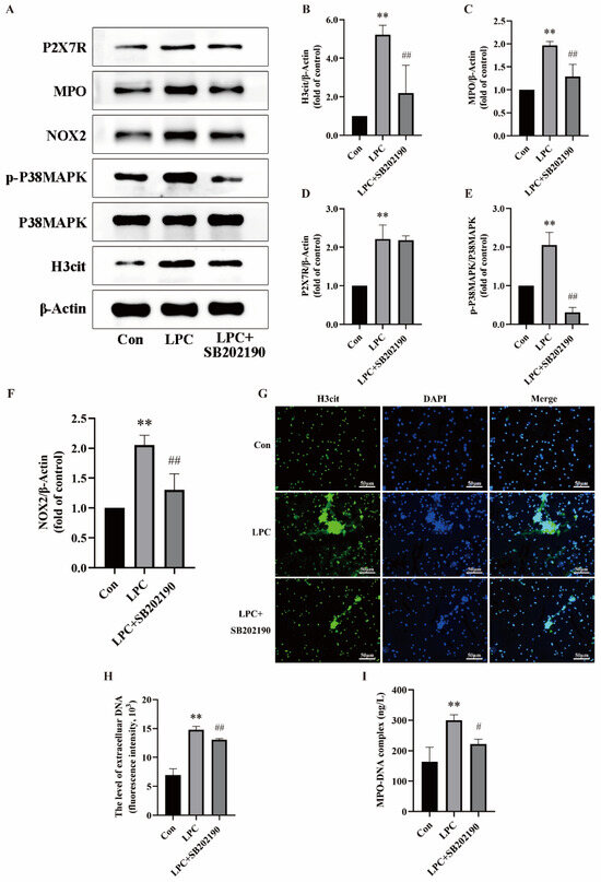 The findings have preliminarily confirmed the association of LPC-induced NETs formation with P2X7R, P38MAPK, and NOX2. However, the relationship between P2X7R, P38MAPK, and NOX2 has not been fully clarified. Our study was further validated by treating neutrophils with SB202190 (10 μmol/L, a P38MAPK inhibitor) to confirm the pivotal role of P38MAPK in LPC-induced NETs formation. The dose of SB202190 is based on the literature [40]. Compared with the LPC-treated group, the expression of H3cit, MPO, and NOX2 were decreased while the expression level of P2X7R did not change in the LPC + SB202190 group (Figure 5A–F). The immunofluorescence findings demonstrated prominent extracellular reticular structures in the LPC group. The co-localization of H3cit and DNA in extracellular reticulated structures was decreased in the LPC + SB202190 co-treated group compared to the LPC group (Figure 5G). Furthermore, there was a decrease in the levels of cf-DNA and MPO-DNA after suppressing the phosphorylation of P38MAPK (Figure 5H,I). These findings demonstrate that NETs formation triggered by LPC is mediated through P38MAPK phosphorylation. The P2X7R/P38MAPK/NOX2 signaling pathway is activated by LPC to induce NETs formation.