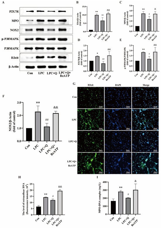 Quercetin inhibits LPC-induced NETs formation by regulating P2X7R. (A) Cells were treated by RPMI1640, LPC (100 μg/mL), LPC + Q (25 μmol/L), or LPC + Q + BzATP (100 µmol/L) for 3 h. Representative immunoblots probed for H3cit, P38MAPK, p-P38MAPK, NOX2, MPO, P2X7R, and β-Actin are shown. (B–F) The ratio of p-P38MAPK/P38MAPK and quantitative densitometric analyses of H3cit, MPO, P2X7R, and NOX2 normalized to β-Actin. (G) The formation of NETs was identified by labeling with H3cit and observed by fluorescence microscopy (scale bar, 50 µm). (H) The supernatant of treated neutrophils was stained with SYTOX green and extracellular DNA was detected using a multimodal reader. (I) The level of NETs marker MPO-DNA in the supernatant was detected by ELISA. Data are expressed as mean ± SD (n = 3). * p < 0.05, ** p < 0.01 vs. the control group. # p < 0.05, ## p < 0.01 vs. the LPC group. & p < 0.05, && p < 0.01 vs. the LPC + Q group.
