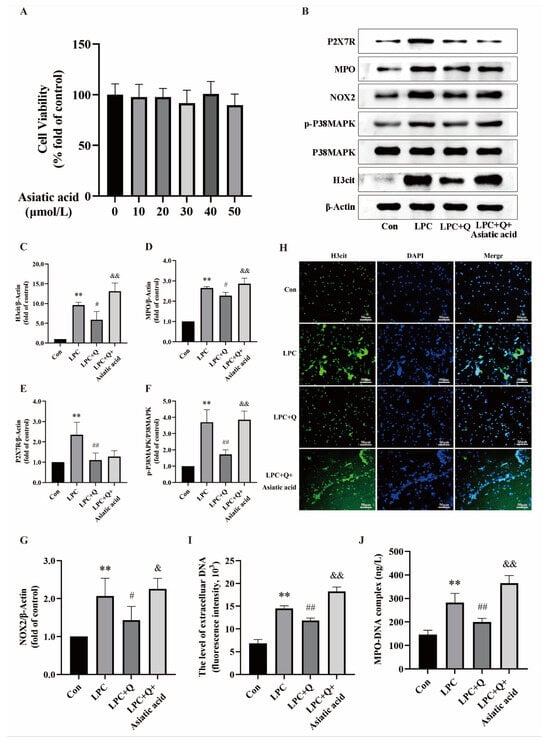 Quercetin inhibits LPC-induced NETs formation by regulating the P2X7R/P38MAPK/NOX2 signal pathway. (A) The effect of asiatic acid on the cell viability of neutrophils (mean ± SD, n = 5). (B) Cells were treated by RPMI1640, LPC (100 μg/mL), LPC + Q (25 μmol/L), or LPC + Q + asiatic acid (20 µmol/L) for 3 h. Representative immunoblots probed for H3cit, P38MAPK, p-P38MAPK, NOX2, MPO, P2X7R, and β-Actin are shown. (C–G) The ratio of p-P38MAPK/P38MAPK and quantitative densitometric analyses of H3cit, MPO, P2X7R, and NOX2 normalized to β-Actin. (H) The formation of NETs was identified by labeling with H3cit and observed by fluorescence microscopy (scale bar, 50 µm). (I) The supernatant of treated neutrophils was stained with SYTOX green and extracellular DNA was detected using a multimodal reader. (J) The level of NETs marker MPO-DNA in the supernatant was detected by ELISA. Data are expressed as mean ± SD (n = 3). ** p < 0.01 vs. the control group. # p < 0.05, ## p < 0.01 vs. the LPC group. & p < 0.05, && p < 0.01 vs. the LPC + Q group.
