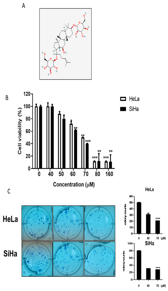 Effect of GF2 on cytotoxicity and colony formation in HeLa and SiHa cells. (A) Chemical structure of GF2 (MW = 785.03). (B) Cytotoxic effect of GF2 in HeLa and SiHa cells. The cells were exposed to various concentrations of GF2 for 24 h, and cell viability was assessed by MTT assay. * p < 0.05, ** p < 0.01, and *** p < 0.001 versus the untreated control. (C) Antiproliferative effect of GF2 in HeLa and SiHa cells. HeLa and SiHa cells were treated with GF2 (0, 50, and 70 μM), and then colony formation took place over 1 week. The colonies were visualized by staining with Diff-Quick solution (Sysmex, Kobe, Japan). The data represent the means ± SD.