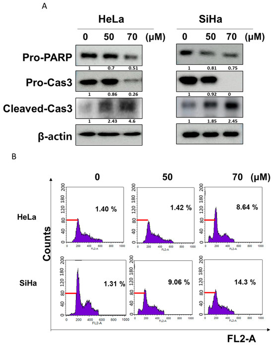 SiHa and HeLa cells (1 × 106 cells/mL) were treated for 24 h with different concentrations of GF2, as described previously [39]. The cells washed with cold PBS were exposed to RNase A (10 mg/mL), subjected to staining with propidium iodide (PI; 50 μg/mL), and analyzed to determine their cell cycle phases by flow cytometry (BD Biosciences; Becton Dickinson and Company, Franklin Lakes, NJ, USA) using the CellQuest Software (Version 5.2.1.).