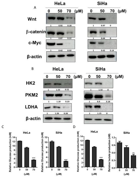 Effect of GF2 on band level of Wnt, β-catenin, c-Myc, HK2, PKM2, and LDHA in HeLa and SiHa cells. (A) Effect of GF2 on Wnt, β-catenin, and c-Myc in HeLa and SiHa cells. (B) Effect of GF2 on HK2, PKM2, and LDHA in HeLa and SiHa cells. (C) Effect of GF2 on glucose production in HeLa and SiHa cells using a colorimetric assay. The results represent the ±SD; *** p < 0.001. (D) Effect of GF2 on lactate production in HeLa and SiHa cells using a colorimetric assay. The results represent mean ± SD; ** p < 0.01, *** p < 0.001.
