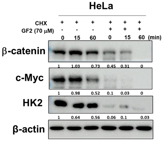 The β-catenin-mediated activation of glycolytic proteins leads to the activation of c-Myc [22], and, consequently, c-Myc upregulates the band level of PKM2, LDHA, and HK2 in cancer cells [23,24]. Here, GF2 diminished β-catenin and c-Myc stability compared to cycloheximide alone, as well as the band level of HK2 in HeLa cells (Figure 4).