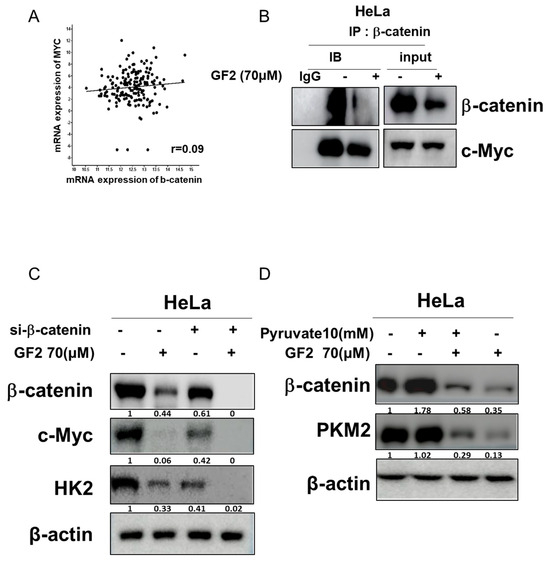 A c-Bioportal database analysis was conducted to demonstrate the correlation between β-catenin and c-Myc, with a Spearman correlation coefficient of 0.09 (Figure 5A). To confirm the interaction between β-catenin and c-Myc, immunoprecipitation was performed in HeLa cells, revealing that, while β-catenin binds to c-Myc in HeLa cells, this was suppressed by GF2 (Figure 5B). Also, to explore the critical role of β-catenin in the glycolysis process, β-catenin siRNA was applied to GF2-treated HeLa cells. β-catenin siRNA diminished the band level of c-Myc and HK2 in HeLa cells (Figure 5A). Previous evidence demonstrates that pyruvate enhances glycolysis, such as TCA cycle flux and ATP production [25,26]. As expected, pyruvate disturbed the ability of GF2 to inhibit PKM2 and β-catenin in HeLa cells (Figure 5B).