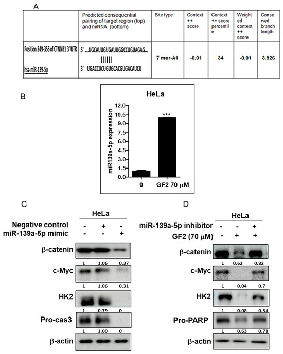 To assess the role of miR139a-5p in GF2-induced apoptosis, Western blotting was carried out in HeLa cells. Herein, GF2 incremented the mRNA level of miR139a-5p in HeLa cells. Consistently, the miR139a-5p mimic decreased the band level of β-catenin, c-Myc, and HK2, whereas the miR139a-5p inhibitor reversed the capacity of GF2 to reduce β-catenin, c-Myc, and HK2 in HeLa cells. Indeed, the TargetScan web server for microRNA biological targets revealed that miR-139a-5p directly bound itself to the 3′-Untranslated region of β-catenin (Figure 6A). In addition, GF2 upregulated the mRNA band level of miR139a-5p in HeLa cells (Figure 6B). Furthermore, the miR139a-5p mimic decreased the band level of β-catenin, c-Myc, HK2, and pro-caspase 3 in HeLa cells (Figure 6C), whereas the miR139a-5p inhibitor reversed the capacity of GF2 to reduce the band level of β-catenin, c-Myc, HK2, and pro-PARP in HeLa cells (Figure 6D).