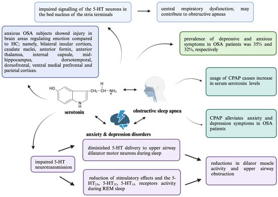 As reported, many pathophysiological processes regarding OSA, such as decreased muscle tension, genioglossal activity, and impaired respiratory processes, are directly influenced by 5-HT modulation. Moreover, OSA frequently co-occurs with psychiatric comorbidities, anxiety, and depression, as well as influences and accelerates the neurodegenerative processes. The origin of psychiatric comorbidities is backed by the 5-HT theory, whereas the role of 5-HT in neurodegeneration and cognitive decline is attributed to the loss of the ability to regulate synaptic plasticity and neuronal survival in the adult brain. The 5-HT regulating medications are reported to significantly improve psychiatric comorbidities and alleviate cognitive decline symptoms; interestingly, they might also be effective in OSA management. Recent studies propose several new avenues for investigation, particularly in understanding the interaction between sleep regulation, architecture, 5-HT, and its receptors.