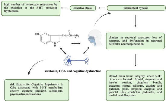 Additionally, OSA patients present with an altered brain tissue integrity in the MRI T1-weighted and T2-weighted images compared to controls, including areas such as the frontal, cingulate and insular cortices, cingulum bundle, thalamus, corpus callosum, caudate and putamen, pons, temporal, occipital, and parietal sites, cerebellar peduncles, and medial medullary sites []. These areas are particularly important for modulating breathing, sympathetic control, and cognitive functions but are also the locations of the 5-HT circuits []. A summary of this information and its expansion can be found in Figure 2.