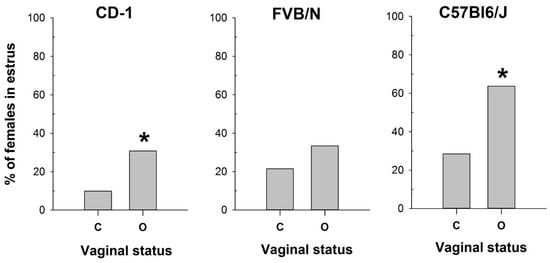 The proportion of female mice with a cytologically estimated estrus with a closed (C) or open (O) vagina: CD-1 (n = 71 and n = 39 for C and O, respectively); FVB/N (n = 79 and n = 31 for C and O, respectively); C57Bl6/J (n = 88 and n = 22 for C and O, respectively). *—p < 0.05 (Chi-square test).