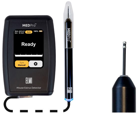In 2015, ELMI Ltd. (Riga, Latvia) initiated the development of the MEDProTM device, primarily focused on determining the vaginal AR in female mice (patent LV15278) [46]. Several versions of the device have been developed and tested, preceding the one presented in this work [42]. These units (Table 1) employ the synchronous detection method, selectively measuring the active resistance of the RS components, thereby eliminating the influence of C as “parasitic” noise on the measurement result. In contrast to the larger probes of MK-11 and MK-12 (Muromachi Kikai Co., Ltd., Japan) estrous cycle detectors, which require time for temperature stabilization of the index, the MEDProTM units feature a miniature probe (Figure 2). This probe comprises two electrodes (∅ = 1.82 mm, 1.2 mm wide, AISI316 material, 1.2 mm electrode spacing) with a low heat capacity, facilitating rapid (<1 s) temperature equalization between probe and tissue. Moreover, the miniature probe (L20xO.D.1.82), when inserted into the mouse vagina (Figure 3), is less traumatic and induces less stress, contributing to improved measurement accuracy.