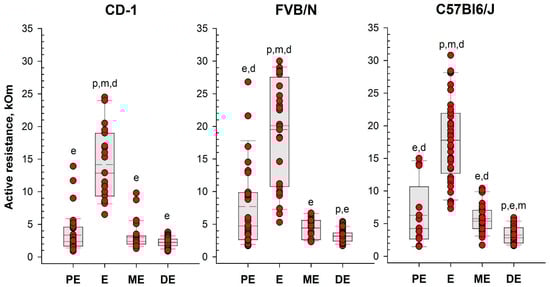 Vaginal active resistance values as a function of the stage of the estrous cycle (PE—proestrus, E—estrus, ME—metestrus, DE—diestrus), determined by vaginal smear in female mice of different strains. Single-value plots show each observation’s value. The box represents the 25th and 75th percentiles and illustrates the median (solid line) and the mean (dashed line). The whiskers show the 10th and 90th percentiles. Letters indicate a significant difference (p < 0.05, Bonferroni test for multiple comparisons) as follows: p—proestrus, e—estrus, m—metestrus, d—diestrus.