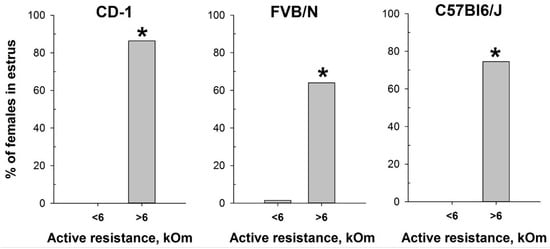 Proportion of female mice with cytologically estimated estrus with AR < 6 kOm or AR > 6 kOm: CD-1 (n = 88 and n = 22, respectively); FVB/N (n = 68 and n = 42, respectively); C57Bl6/J (n = 55 and n = 55). *—p < 0.001 (Chi-square test).