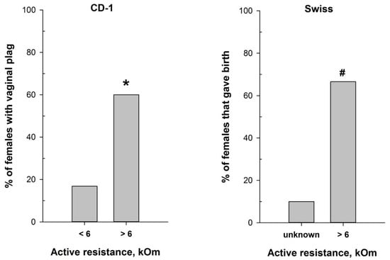 Mating efficiency in female mice with different values of vaginal active resistance after overnight pairing with male. (left panel)—proportion of CD-1 females with vaginal plug (n = 97 for AR < 6 kOm; n = 25 for AR > 6 kOm); (right panel)—proportion of Swiss females that gave birth (n = 10 for ‘unknown”; n = 9 for AR > 6 kOm). *—p < 0.001 (Chi-square test); #—p < 0.001 (Fisher’s exact test).
