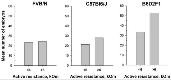 Number of oocytes per mouse produced after mouse superovulation started at different vaginal AR values—AR < 6 kOm or AR > 6 kOm: FVB/N (n = 19 and n = 5, respectively); C57Bl6/J (n = 29 and n = 15, respectively); B6D2F1 (n = 51 and n = 9, respectively).