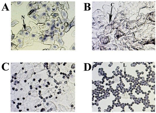 The cytology of mouse estrous cycle stages is characterized by regularly repeating combinations of distinct cell types: leucocytes—L, nuclear epithelial cells—N, and cornified epithelial cells—C (Figure 9A–D). The presence of these cell types correlates with the condition of the vaginal mucosa, is related to the state of the ovaries and uterus, and depends on the levels of different sex hormones circulating in the blood. In the standard mouse estrous cycle (4–5 days), the first stage, proestrus, is characterized by abundant nucleated epithelial cells (Figure 9A) and lasts approximately one day, followed by estrus. The estrus is usually identified by large numbers of cornified (keratinized) epithelial cells with irregular margins (Figure 9B). The predominance of keratinized cells in the vagina lasts for one to two days (depending on the 4 or 5 days of the estrus cycle) and continues until the metestrus stage, which occurs after ovulation. Metestrus is a transitional period between estrus and diestrus, characterized by leukocytes, nucleated epithelial cells, and significant numbers of cornified epithelial cells (Figure 9C). The metestrus lasts about one day and is followed by the diestrus stage, where leukocytes are present together with rounded epithelial cells with nuclei in varying concentrations. The vaginal smear can often appear almost exclusively leucocytic during diestrus (Figure 9D).