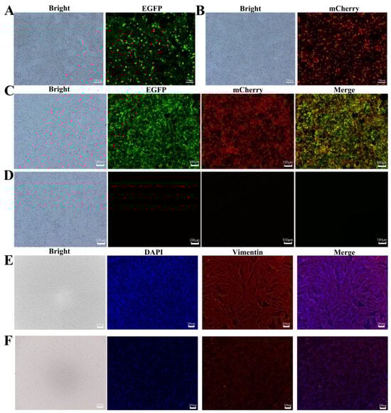 Lentiviral transduction of 293T cells and immunofluorescence identification of fibroblasts. (A) Packaging results of FUW-tetO-OSM-EGFP lentiviral vector; (B) Packaging results of FUW-tetO-KNL-mCherry lentiviral vector; (C,D) Expression of fluorescent proteins in 293T cells after lentiviral transduction; (C) is the experimental group, (D) is the control group; (E) Immunofluorescence identification of yak fibroblasts; (F) Immunofluorescence identification of mouse fibroblasts, with red fluorescence indicating vimentin.