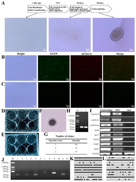 Reprogramming of yak fibroblasts and preliminary pluripotency identification. (A) Reprogramming steps and morphological changes of yak fibroblasts; (B,C) Expression of fluorescent proteins in yak fibroblasts after lentiviral transduction; (B) is the experimental group, (C) is the control group; (D–G) AP staining of yak iPSCs; (D) shows the clone morphology on a six-well plate before staining, (E) shows the clone morphology on a six-well plate after staining, (F) shows AP-stained clones, (G) shows the number of positive clones in three replicate wells; (H) PCR for the methylation-status detection of the Oct4 promoter region; (I) RT-PCR detection of pluripotency-related genes in yak iPSCs, with gonadal ridge as the positive control and BEF as the negative control; (J) RT-PCR detection of related genes in fibroblasts after lentiviral transduction; M is marker 2000. Experimental group: 1 for Oct4 (242 bp), 3 for Sox2 (215 bp), 5 for c-Myc (221 bp), 7 for Klf4 (354 bp), 9 for Nanog (309 bp), 11 for Lin28 (204 bp); control group: 2 for Oct4, 4 for Sox2, 6 for c-Myc, 8 for Klf4, 10 for Nanog, 12 for Lin28; (K) Methylation status of the Oct4 promoter region in yak fibroblasts; (L) Methylation status of the Oct4 promoter region in yak iPSCs.