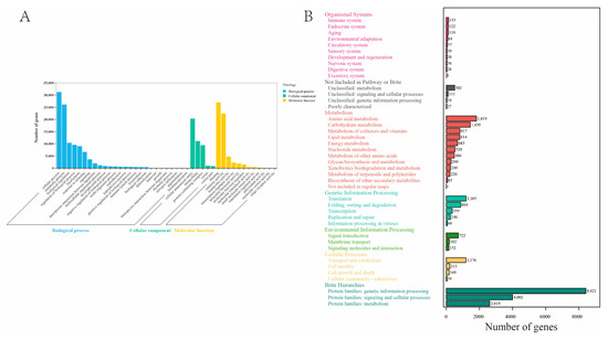 The Gene Ontology (GO) and Kyoto Encyclopedia of Genes and Genome (KEGG) databases were used for transcript annotations, with 53,017 unigenes in at least one of the three GO terms (Supplementary Table S2). Biological processes were the most representative corresponding to cellular processes and metabolic processes. A total of 12 terms in molecular functions were found, with binding being the most representative subcategory, followed by catalytic activity, transport, and biological regulation. Then, five categories were assigned cellular components, with the most represented subcategories being cellular anatomical entity and intracellular (Figure 1A). Meanwhile, the annotations of unigenes in KEGG showed that the most enriched entries for genetic information processing contain 8421 unigenes, and 4002 unigenes were enriched in the signaling and cellular processes term (Supplementary Table S3). The unigenes were enriched in the sensory system and nervous system entries (Figure 1B). Currently, there is limited research on the chemosensory-related proteins of O. leucomelaena, but through unigene enrichment analysis, it is not difficult to find that there are chemosensory-related genes within its body that are in urgent need of exploration.