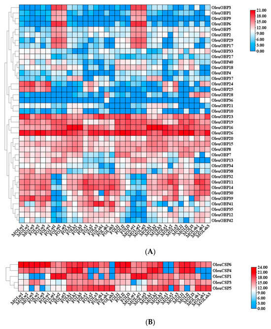 Total RNA was isolated from samples using the TRIzol reagent (Invitrogen, Carlsbad, CA, USA). Subsequently, the synthesis of the first-strand cDNA was carried out with the aid of the PrimeScript™ RT reagent Kit (TaKaRa, Tokyo, Japan), adhering to the manufacturer’s protocol. To evaluate the tissue-specific expression profiles of OleuOBPs, quantitative real-time PCR (qRT-PCR) was utilized. This process was conducted on the ABI PRISM 7500 platform (Applied Biosystems, Foster City, CA, USA). The PCR mix included 10 μL of SYBR Premix Ex TaqTM II (TaKaRa, Tokyo, Japan), 1 μL each of the primers at a concentration of 10 μmol/L, 2 μL of the cDNA template, 0.4 μL of the Rox Reference Dye II, and 5.6 μL of nuclease-free water to complete the volume. The thermal cycling conditions initiated with a denaturation step at 95 °C for 30 s, followed by 40 cycles of denaturation at 95 °C for 5 s and annealing/extension at 60 °C for 34 s.