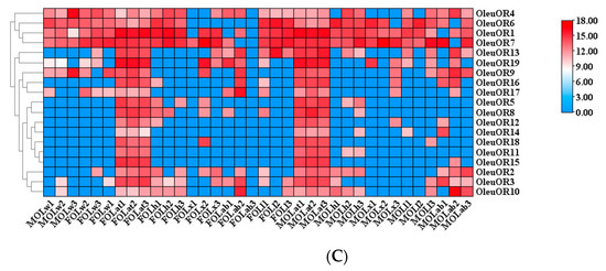 Expression profiles of chemosensory-related genes in O. leucomelaena. (A): OleuOBPs; (B): OleuCSPs; (C): OleuORs. OL: O. leucomelaena. FOLw: female wing; MOLw: male wing; FOLat: female antenna; MOLat: male antenna; FOLh: female head; MOLh: male head; FOLx: female thorax; MOLx: male thorax; FOLl: female leg; MOLl: male leg; FOLab: female abdomen; MOLab: male abdomen.