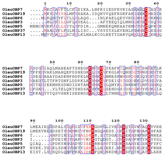Alignment of the identified classic OleuOBPs. Conserved cysteine residues are selected and highlighted on a red background.