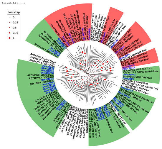To identify candidate chemosensory-related genes from O. leucomelaena, chemosensory-related gene families from other coleoptera species were selected as queries to search the new stand-alone transcriptome of this beetle. TBLASTN was used to search and identify candidate chemosensory-related genes against the O. leucomelaena transcriptome, with an E-value cutoff of 1 × 10−5 [41]. Further, these identified genes were verified using TBLASTX against the NCBI non-redundant protein sequence database. ORFs were identified using the ORF Finder in NCBI (https://www.ncbi.nlm.nih.gov/orffinder/ (accessed on 10 January 2024)). In the set of trees, a multiple sequence alignment was performed using the Muscle method in MEGA7.0 [42]. An Neighbor-Joining tree of OBP was constructed by iTOL v5 [43]. Accession numbers of all protein sequences from other coleoptera species used in the phylogenetic analysis are listed in Supplementary Materials.