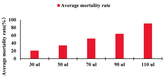 Laboratory-cultured unmedicated anise leaves were fed to O. leucomelaena for 3 days and then grouped for chemical fumigation experiments. Using fumigation toxicity tests, 30, 50, 70, 90, and 110 μL of the mixture (solvent: n-hexane, (Z)-anethole 900 μg/mL, β-caryophyllene 30 μg/mL, 4-allylanisole 3 μg/mL, and 3-carene 2 μg/mL, in a ratio of 653:23:2:1) were added to culture dishes (150 × 25 mm), respectively. Each group consisted of 30 adult O. leucomelaena (15 females, 15 males) placed in culture dishes lined with filter paper. The treated culture dishes were placed in a refrigerator at 6 °C for one hour. After 1 h, the dishes were taken out of the refrigerator and left to stand for 30 min. The O. leucomelaena was removed for observation and examined under an in stereo microscope (Nikon AZ100, Tokyo, Japan) with a clean brush and tweezers; no response to touch was considered dead. The survival rate of O. leucomelaena was then reported, and the mortality rate was calculated.