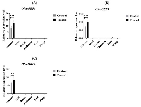 Analysis of OleuOBP gene expression after compound treatment. The standard error is represented by the error bar, and the ** indicates a very significant difference, and *** indicates an extremely significant difference. (A): OleuOBP3; (B): OleuOBP5; (C): OleuOBP6.