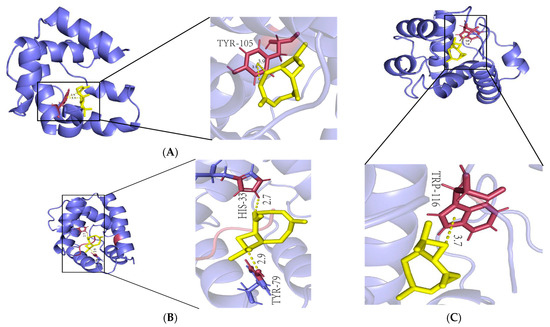 Molecular docking simulations were conducted using the four compounds from the fumigation experiment with antennae-specific OBPs. The results of the molecular docking indicated that OleuOBP3, OleuOBP5, and OleuOBP6 all exhibited high affinity for the four compounds, with β-caryophyllene showing the strongest binding affinity for all three OleuOBPs (binding energy < −21 kJ/mol, Table 1). Visualizing the protein–ligand docking structures revealed the following binding active sites: β-caryophyllene bound to OleuOBP3 at site TYR-105 (Figure 7A), to OleuOBP5 at site TYR-79 and HIS-33 (Figure 7B), and to OleuOBP6 at site TRP-116 (Figure 7C).