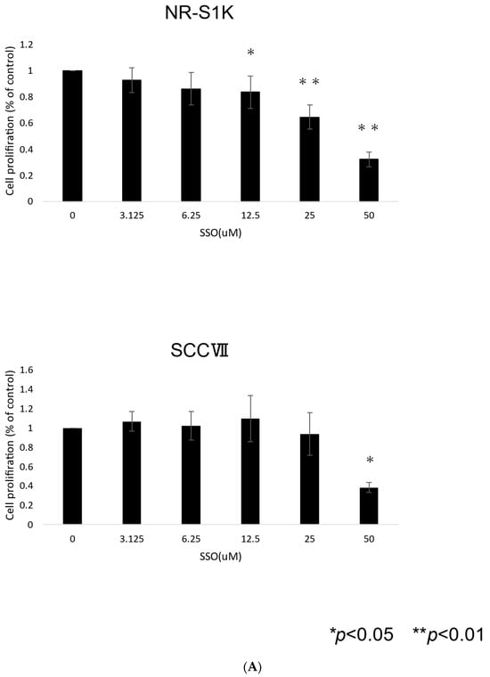 Cell proliferation assays were performed, as described previously []. The OSCCs were seeded in 96-well plates at a density of 1.5 × 104 cells/well and cultured for 72 h in the presence or absence of various concentrations of SSO. The viability of adherent cells was measured by adding (WST-1) premix (Takara Bio, Kusatsu, Japan), according to the manufacturer’s instructions.