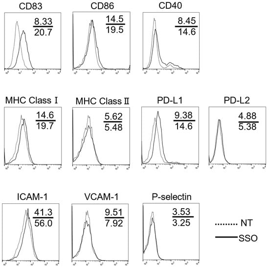 To confirm the effect of the selective inhibition of CD36 on the surface antigen expression changes of OSCCs, we compared the expression level of various T cell costimulatory and adhesion molecules on OSCCs with or without SSO treatment. As shown in Figure 2, the OSCCs treated with SSO showed increased levels of costimulatory molecules, including CD83, MHC class I, and PD-L1, compared to non-treated cells. Conversely, there were no changes in the expression levels of CD86, CD40, MHC-class II, orPD-L2 molecules.